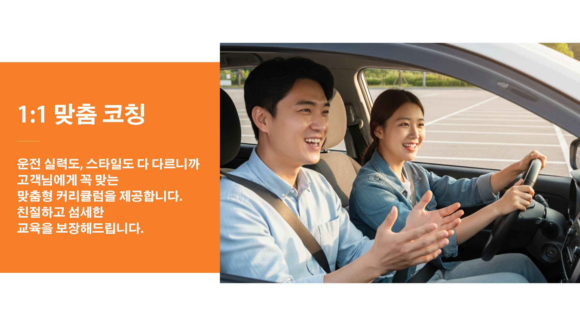 초보자 맞춤형 1:1 실전 주행으로 진행됩니다.